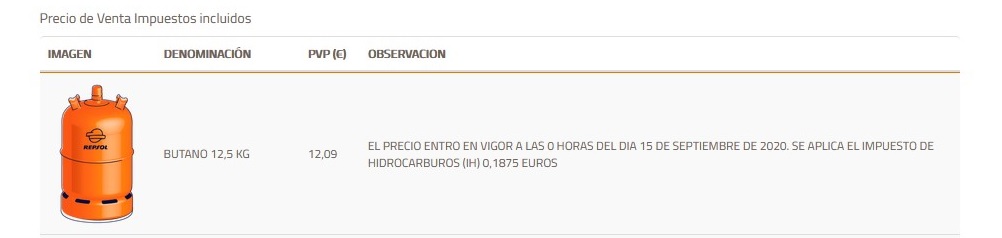 Nos han informado varios clientes que, a día de hoy, el precio que están cobrando por los servicios de la bombona de butano doméstica, de 12,5 kg, es de TRECE EUROS CON CUARENTA CÉNTIMOS (13,40 €).
